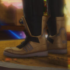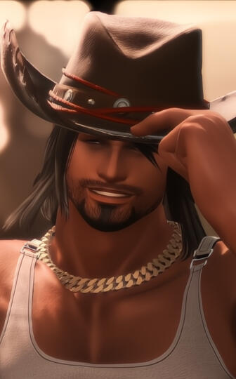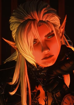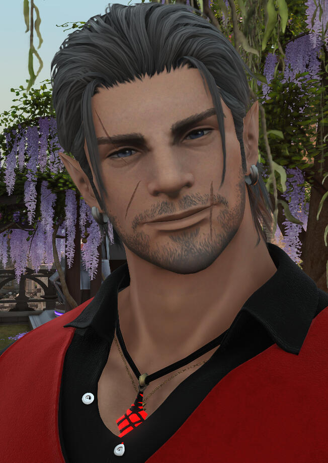 notable features/common accessories. The hair, the light freckles, the mismatched eyes, and the shit-eating grin, obviously. - A bright blue aetheryte earring in his right ear; Golden sneakers. You heard me; Heart-shaped sunglasses. Less common: A knee brace. Those are the days he trades his shorts for his jeans.